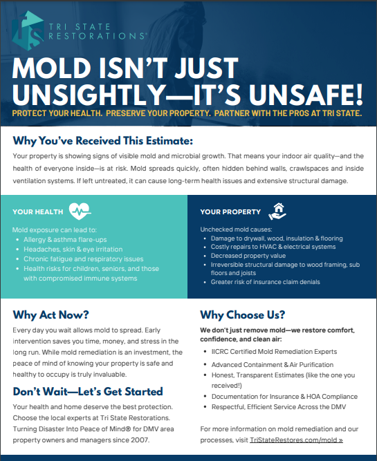 When the Stevens family discovered microbial growth and mold in their home, they turned to Tri State Restorations, the D.C. metro area’s trusted, family-owned restoration and recovery experts. Follow the complete customer journey — from initial inspection and air quality testing to professional mold remediation, cleanup, and recovery. Learn how our IICRC certified restoration and remediation technicians identify moisture issues, contain mold hazards and safely return your property to safety and healthy living conditions.